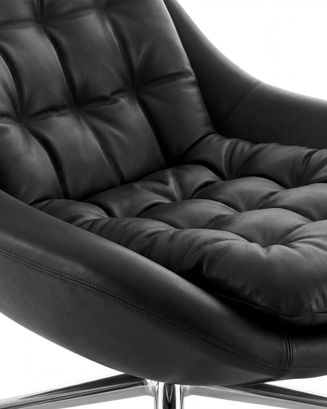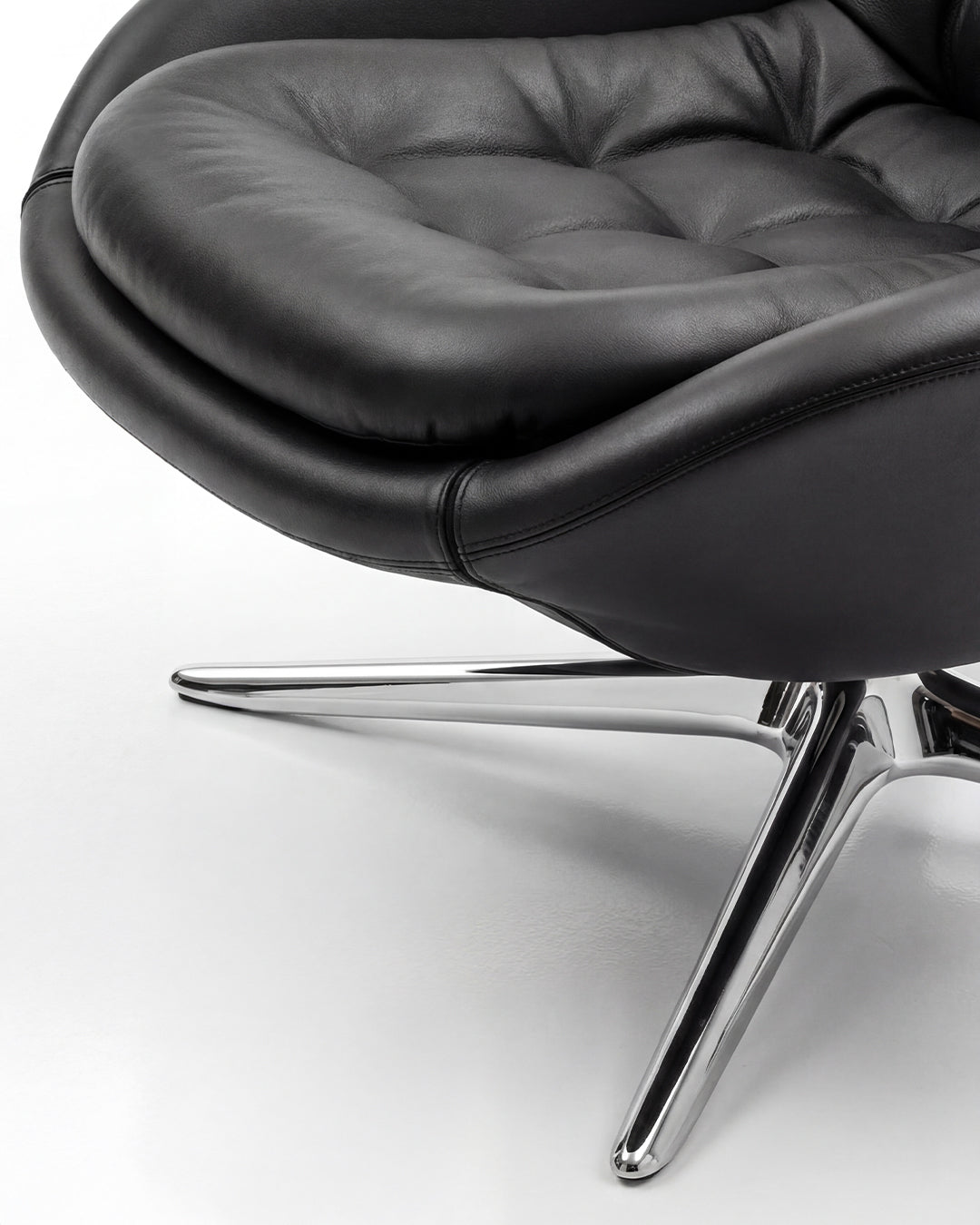 The swivel base, crafted from moulded cast aluminium, offers both mobility and stability, with a polished chrome finish that complements the design with an elegant, modern touch.